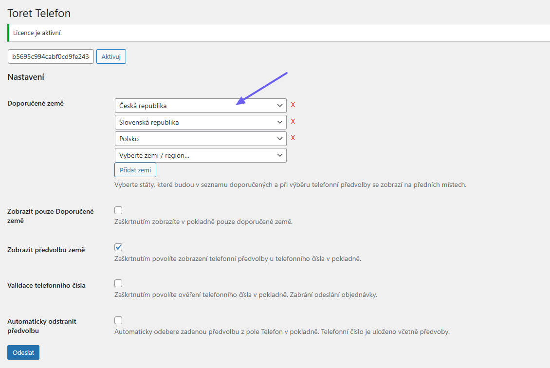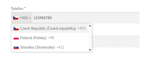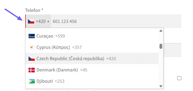 Pokud zákazník předvolbu nevybere, ale napíše, automaticky se zobrazí v levém políčku i se správnou vlajkou. Aby však zákazníky nemátlo dvojí zobrazení předvolby, aktivujte funkci Automaticky odstranit předvolbu.