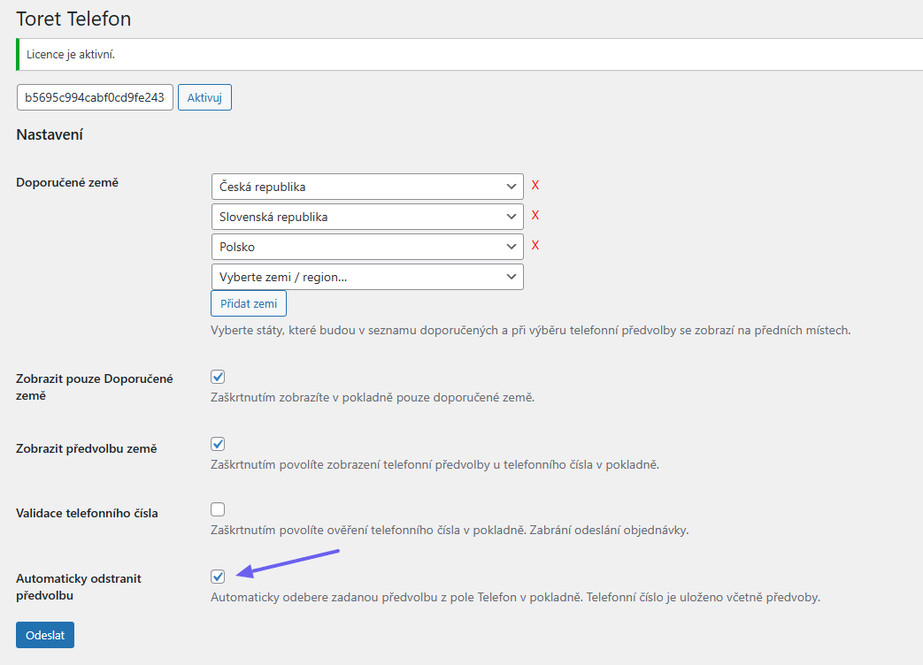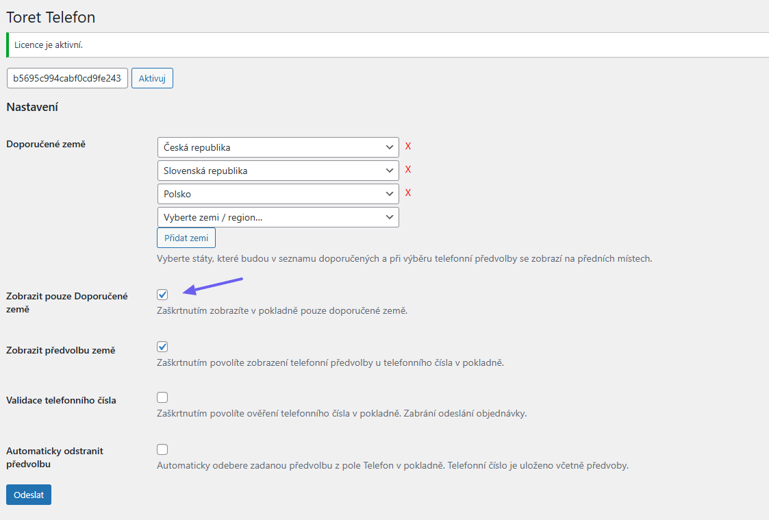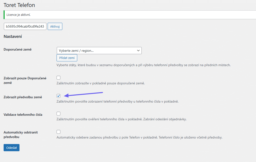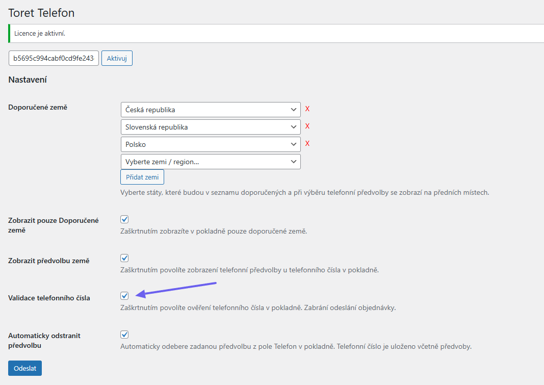 Validaci aktivujete jednoduše zaškrtnutím checkboxu Validace telefonního čísla.