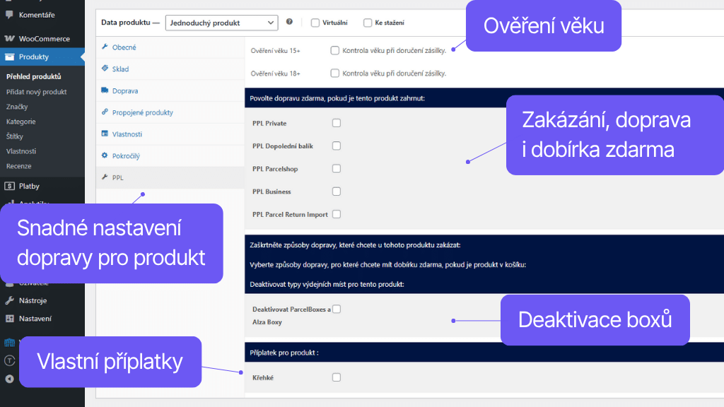 Při úpravě produktu v boxu Data produktu → záložce PPL si můžete zaškrtnout požadovanou kontrolu věku při přebrání zásilky.