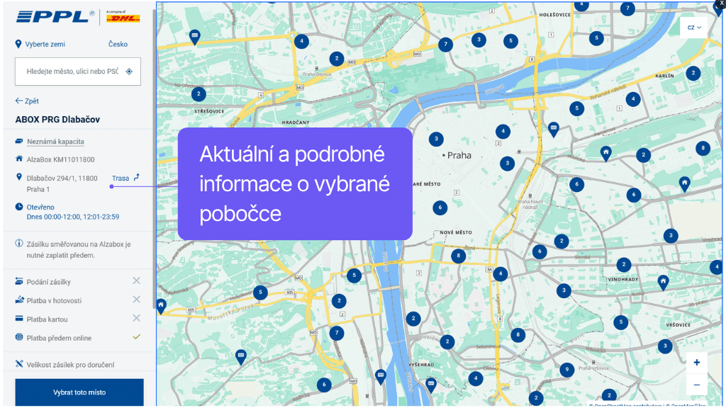 Bezproblémový výběr pobočky v pokladně zajistí oficiální PPL widget s mapou, který umožňuje i textové vyhledávání, filtrovaní a zobrazení informací o pobočkách.