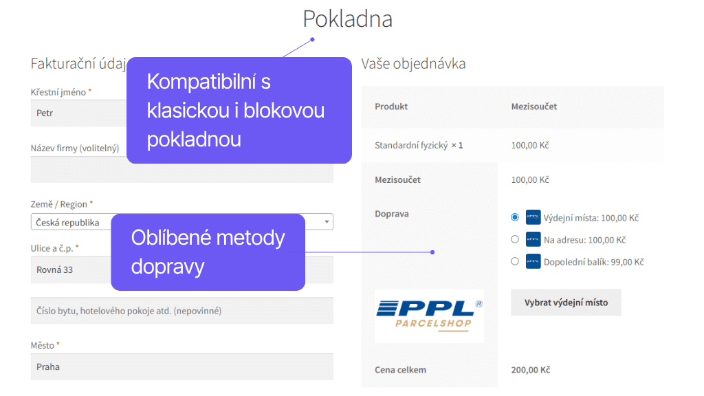 Pomocí pluginu si mohou zákazníci v pokladně vybrat výdejní místa a boxy PPL Parcelshop. Doručování do boxů lze zakázat – globálně či pro konkrétní produkty, varianty a kategorie.
