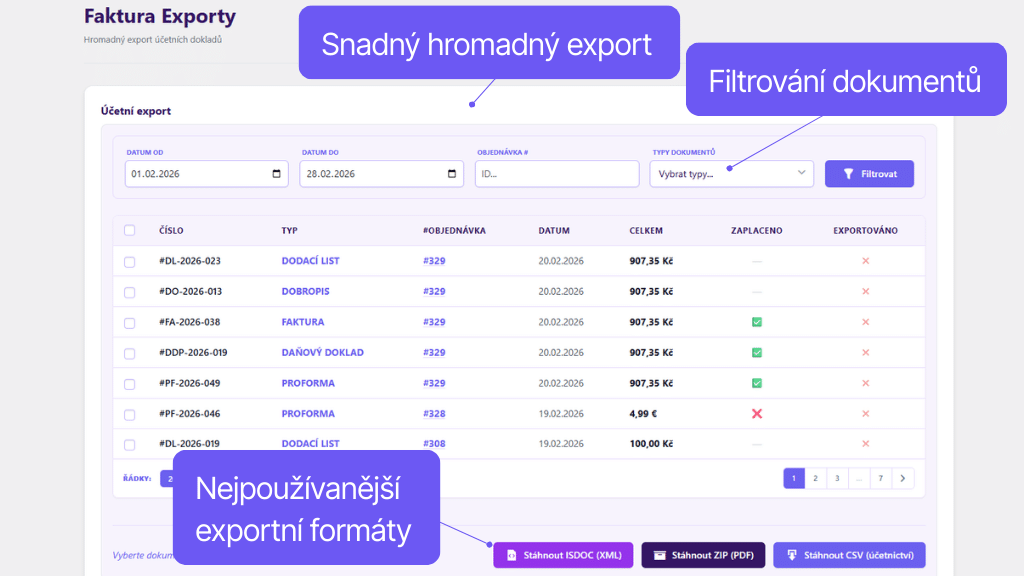Při vytváření exportů je možné využít filtrování podle data vystavení a typu dokumentu nebo vyhledávat dle čísla objednávky.
