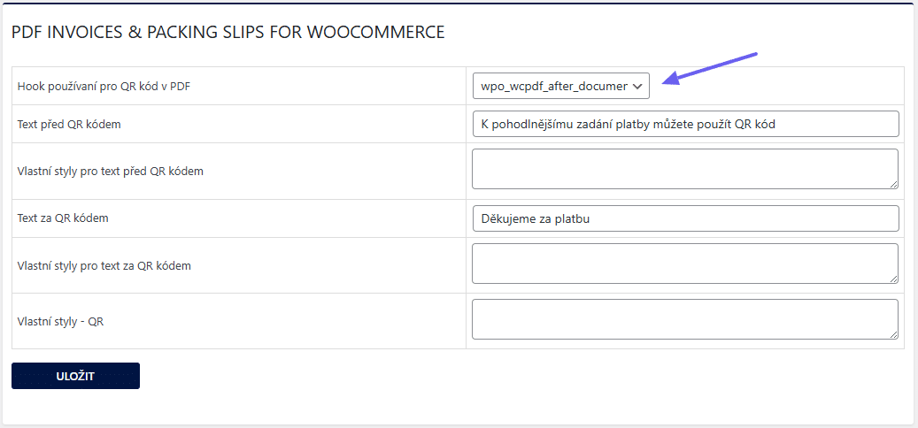 V nastavení pluginu QR platby je karta PDF Invoices & Packing Slips for WooCommerce, kde jednoduše nastavíte hook, tzn. místo, na kterém se na faktuře QR kód zobrazí.