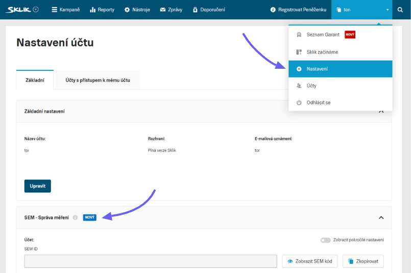 Nejprve mrkněte do vašeho účtu Sklik, zda v sekci nastavení již máte box pro SEM měření. Přístup k této funkci totiž uživatelům nabíhá postupně.