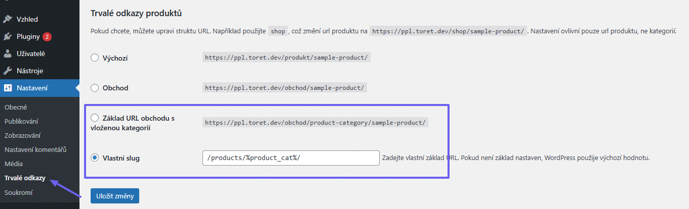 Strukturu URL zkontrolujete či přenastavíte v Nastavení > Trvalé odkazy > Trvalé odkazy produktů.